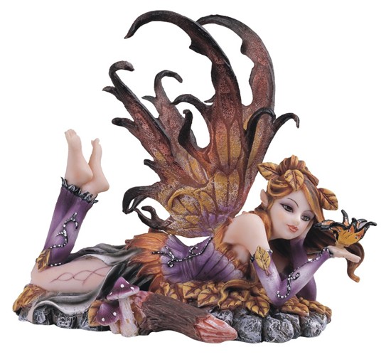 Step into a magical autumn world with this enchanting 6-inch fairy, delicately perched among vibrant fall leaves. Her elegant wings shimmer with soft hues, and a butterfly rests gently on her outstretched hand, capturing the spirit of the season. This beautifully crafted fairy captures the essence of autumn, adding a whimsical touch to any space.