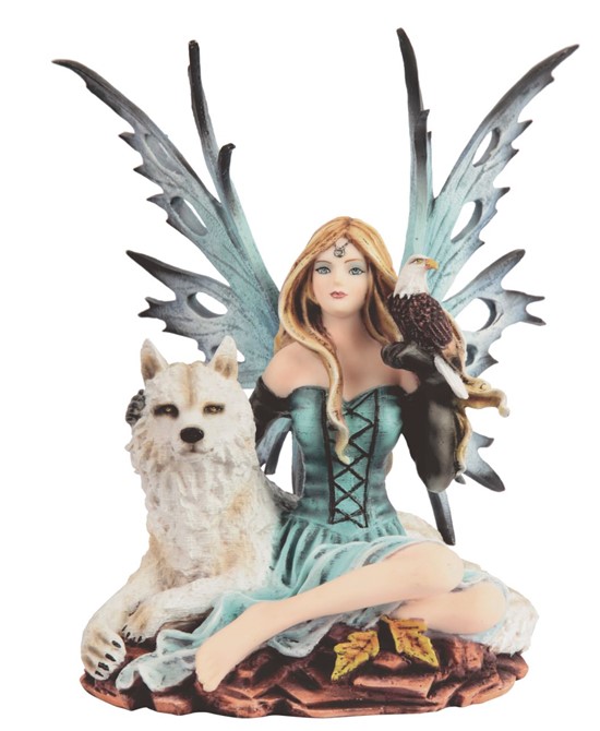 Experience the power and mysticism of nature with the 8-inch Blue Fairy, accompanied by a majestic wolf and eagle. The fairy, with her shimmering blue wings, stands in harmony with the noble creatures by her side, symbolizing a deep connection with the natural world. This enchanting piece captures the essence of the wild, blending fantasy with the strength of nature’s guardians.