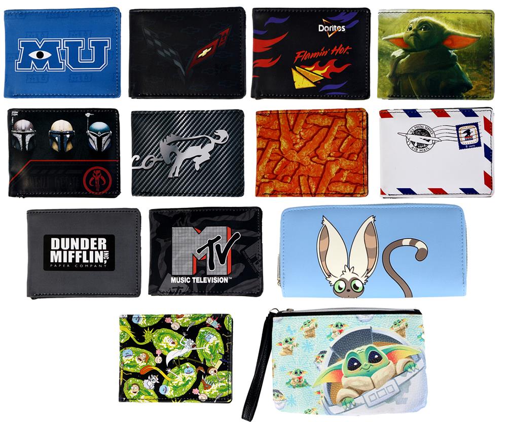 The Licensed Wallet Assortment offers a collection of stylish and functional wallets featuring popular designs from iconic brands. Perfect for fans and collectors, each wallet is crafted from durable materials, ensuring long-lasting use. With various designs to choose from, including logos, characters, and unique prints, these wallets combine practicality with personality, making them a must-have accessory.